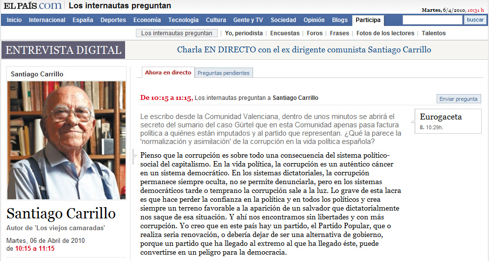 Santiago Carrillo ha participado en un interesante encuentro digital en elpais.com. Eurogaceta ha preguntado a Carrillo, coincidiendo con el levantamiento del sumario del caso Gürtel, sobre la ‘normalización y asimilación’ de la corrupción en territorios como la Comunidad Valenciana, y esta ha sido su respuesta: