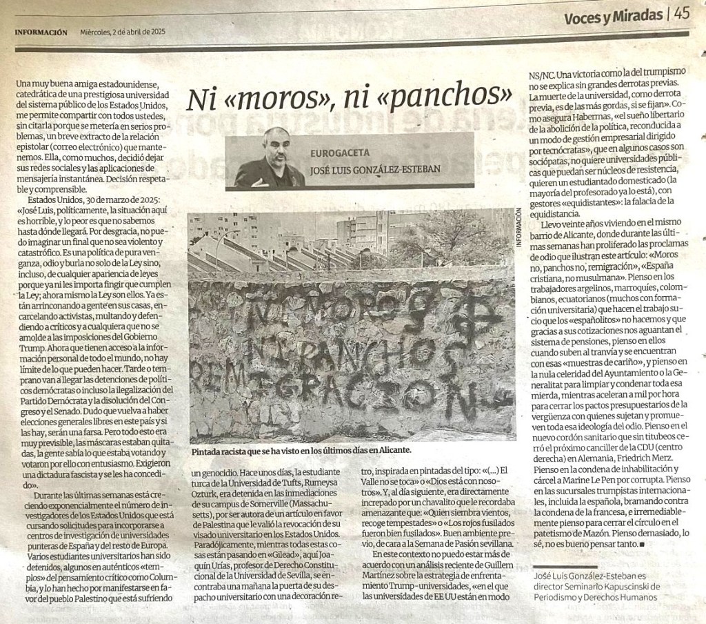 Estados Unidos, 30 de marzo de 2025: «José Luis, políticamente, la situación aquí es horrible, y lo peor es que no sabemos hasta dónde llegará. Por desgracia, no puedo imaginar un final que no sea violento y catastrófico (…)».